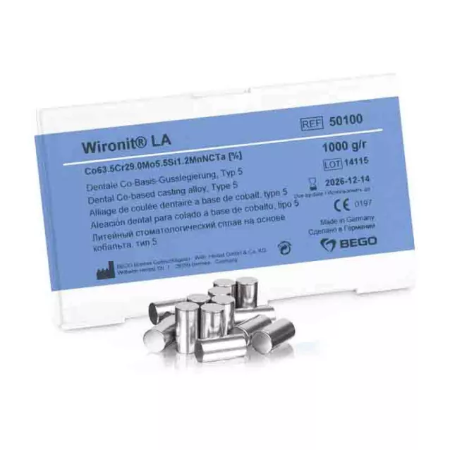 Alliage universel pour prothèses à crochets et travaux combinés. Excellentes propriétés pour la soudure au laser, connexions solides, même dans des situations extrêmes. Mise en oeuvre aisée selon le système BEGO. Ses propriétés sont nettement supérieures aux normes exigées - DIN EN ISO 6871-1 et autres normes nationales. Fourni avec certificat de contrôles biologiques complémentaires effectués par des instituts indépendants.Dispositif médical Classe IIa. Marquage CE0197. Fabriquant BEGO