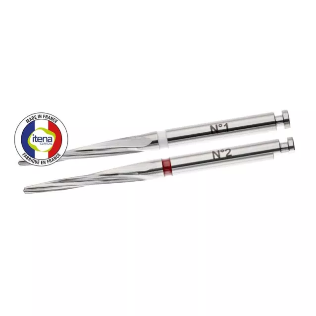 La boîte de 4 forets coniques - 1 clé manuelle. Préparent en toute sécurité le logement du tenon radiculaire - Le foret conique N° 1 prépare les canaux pour les pivots coniques jaunes (9 mm), oranges (11 mm), et rouges (13 mm) - Le foret conique N° 2 prépare les canaux pour les pivots coniques verts (12 mm), bleus (14 mm) et violets (16 mm). Forets en acier chirurgical garantissant une parfaite protection contre la corrosion. Les forets Dentoclic sont rectifiés permettant une précision au micron près. Assure plus de tolérance. La forme hélicoïdale de la denture de forets Dentoclic permet un pouvoir de coupe supérieur et une évacuation plus aisée des débris. Dispositif médicale de Classe IIa. Marquage CE0120. Fabricant : Itena. N° Mixte, 2x N° 1 - 2x N° 2