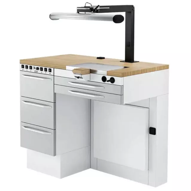 Comprenant : 2 tiroirs sous cheville. 1 meuble de rangement 3 tiroirs à droite ou à gauche de la cheville. 1 prise électrique et 1 soufflette à rappel - 1 panneau de contrôle. Structure et façades selon nuancier ARIES. Plan de travail au choix : blanc, gris ou imitation bois.Eclairage Glux en sus.